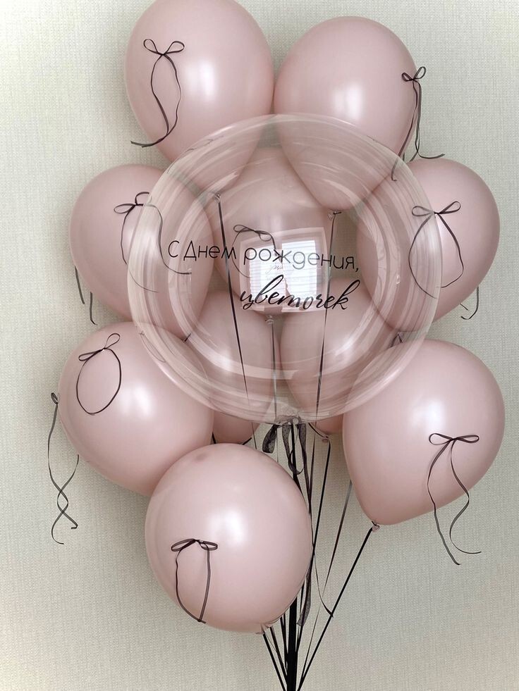 - Фонтан из шаров: 10 латексных шаров с бантиками, 1 баблс с индивидуальной надписью