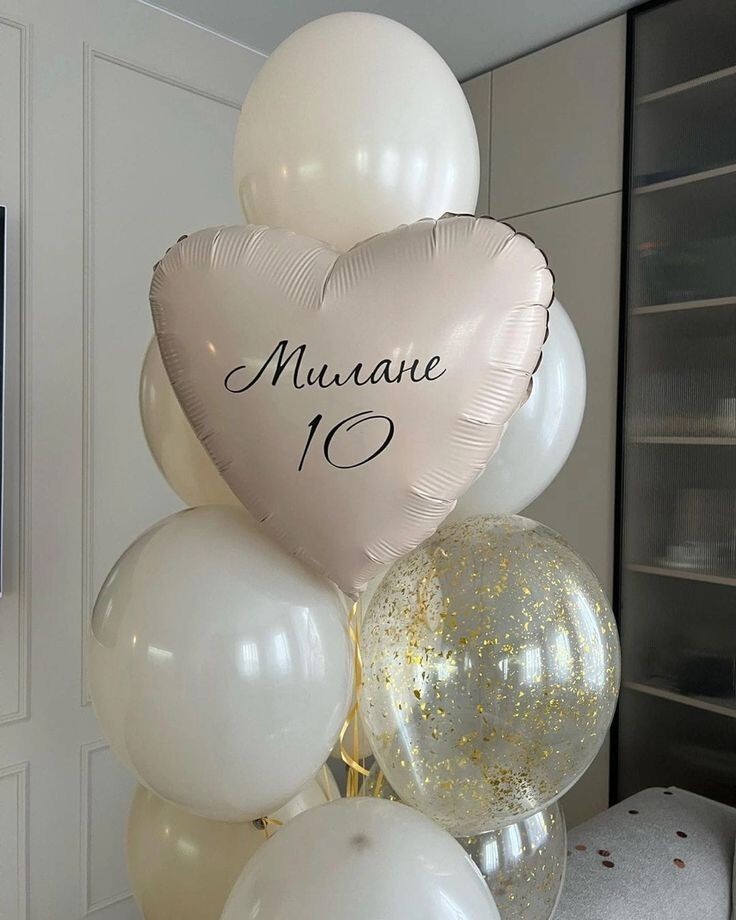 - Фонтан из шаров: 7 однотонных латексных шара, 1 фольгированное сердце с индивидуальной надписью, 2 шар с конфетти