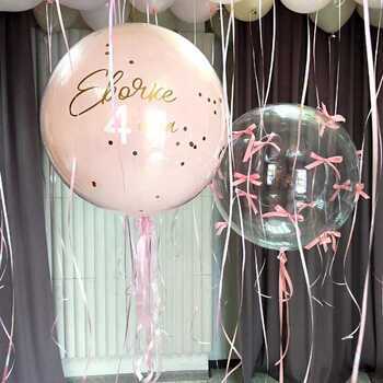 Вы можете увидеть большой стекляный шар с конфети и надписью и грузиком, и стеклянный шар меньше с бантиками и грузиком.