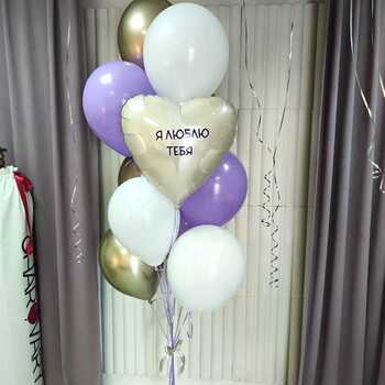 Перед вами представлена композиция из 6 шаров с гелием пастель, и 4 шара с гелием хром. Также фольгированный шар в виде сердца с надписью "Я люблю тебя".
