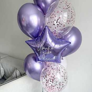 Перед вами представлена композиция из 4 шаров хром, 3 пастельных шарика , 2 прозрачных шарика с конфетти , шар фольгированный в виде звезды с индивидуальной надписью. Вся композиция на грузике.