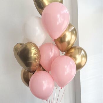 Вы можете увидеть набор из 6 латексных шаров и 3 перламутровых. Также дополняют композицию 2 фольгированных сердца. Всё представлено на грузике.