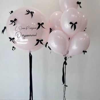 Перед вами представлен большой стеклянный шар "С днём рождения" с бантиками и 7 обычных шаров на гелие перламутровых с бантиками. Большой шар на грузике, а также 7 шаров на грузике.