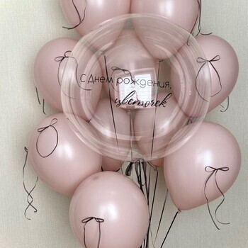 Представлена композиция из большого прозрачного шара с надписью в две строчки, и 10 перламутровых шариков. Вся композиция держится на одном грузике.