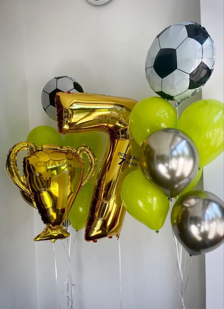 - Фонтан из шаров: 4 пастельных шара, 1 фольгированная фигурка футбольного мяча