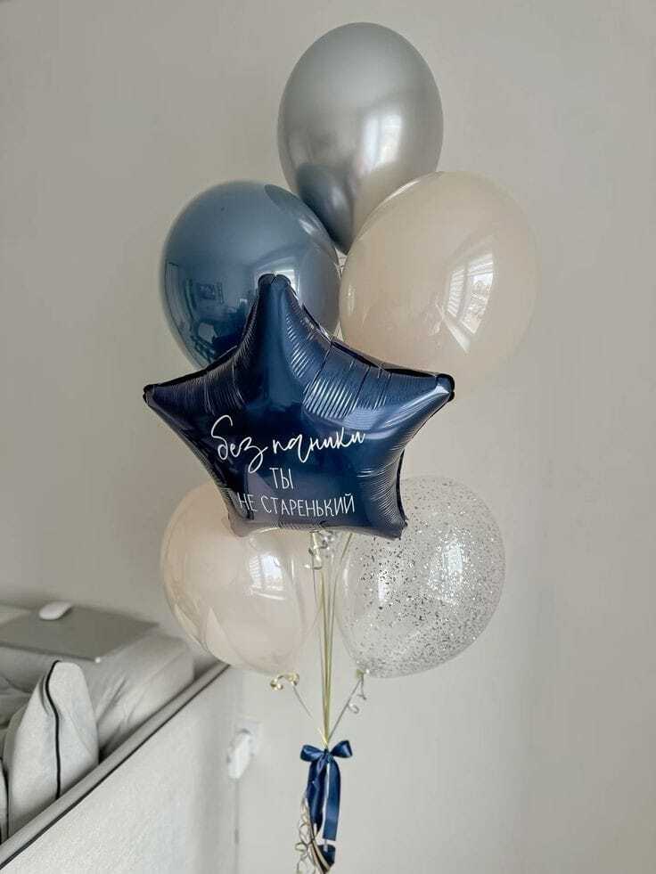 - Фонтан из 6 шаров: 2 зеркальных малых шара, 2 шара хром, 1 шар с конфетти, 1 фольгированная звезда с индивидуальой надписью
