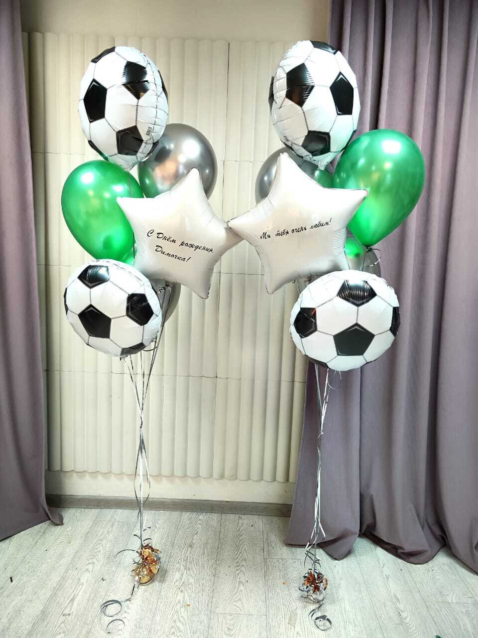 - 2 фонтана из шаров, каждый из которых состоит из 2 фольгированных шаров, 1 пастельного шара, 2 шаров хром, 1 фольгированной зведа с индивидуальной надписью