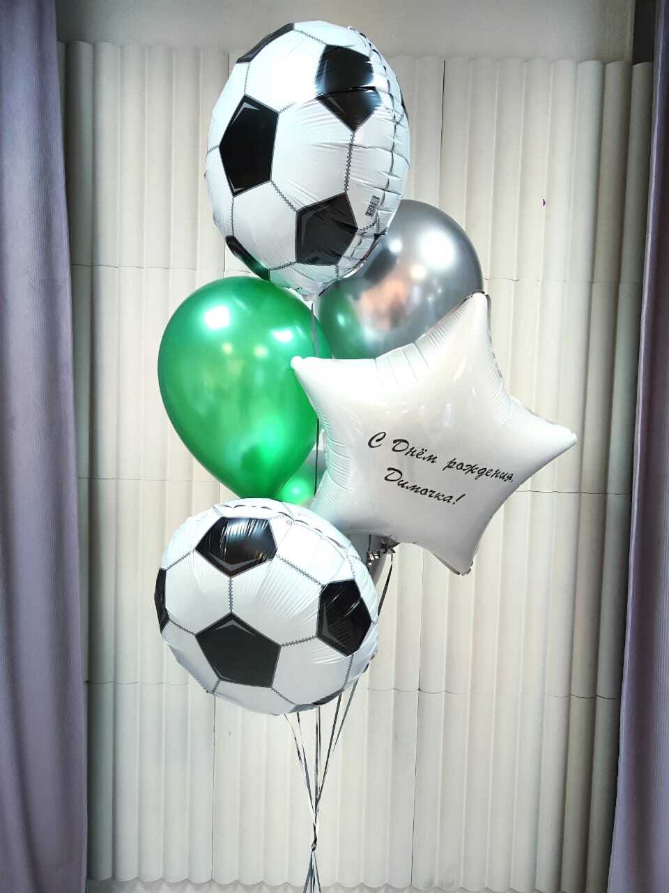 - Фонтан из 6 шаров: 2 фольированных мяча,1 пастельный шар, 2 шара хром, 1 фольгированная звезда с индивидуальной надписью