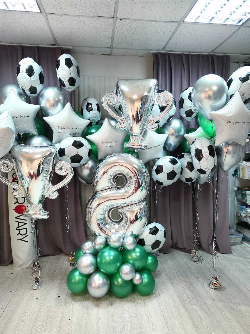 - 7 фонтанов, каждый из которых состоит из 2 фольгированных шаров в виде мяча, 2 шара хром, 1 пастельный шар, 1 фольгированная звезда с индивидуальной надписью