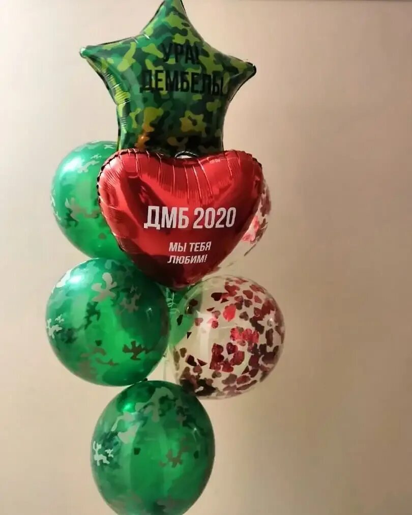 - Фонтан из шаров: фольгированная звезда с индивидуальной надписью, 4 шара с принтом, 1 шар с конфетти, фольгировнное сердце с индивидуальной надписью