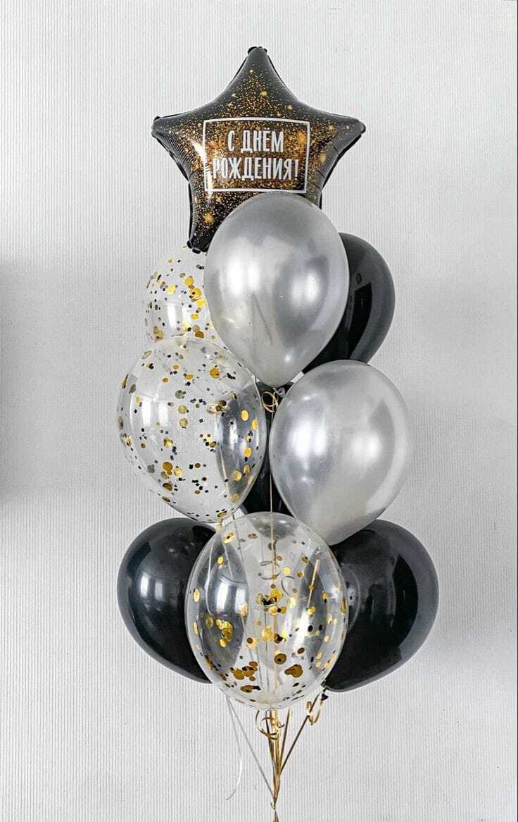 •Фонтан из 9 шаров: 1 фольгированная звезда с надписью, 2 перламутровых шара,4 латексных , 3 шара с конфетти