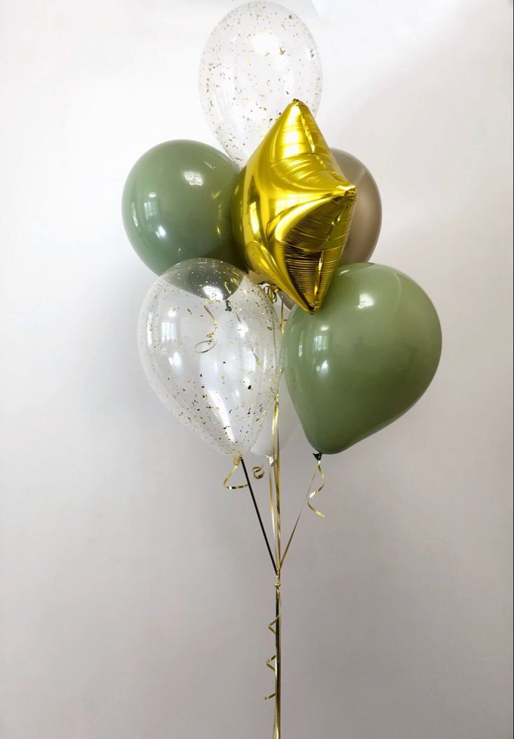 - Фонтан из шаров: фольгированая звезда, 2 однотонных шар, 1 шар хром, 2 шара с конфетти