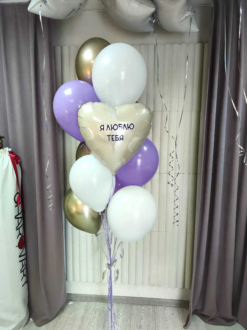- Фонтан из шаров: 7 пастельных шаров, 3 шара хром, 1 фольгированное сердце с индивидуальной надписью