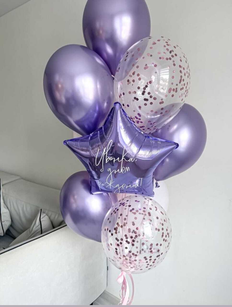 - Фотан из 9 шаров: 1 фольгированная звезда с индивидуальной надписью, 4 хром, 2 конфетти, 2 латексные