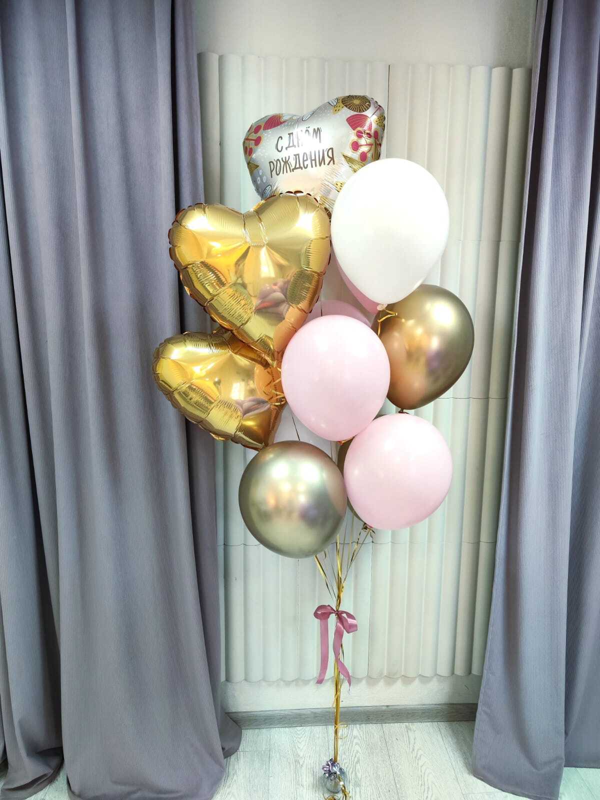 Яркий набор из шаров состоит из фольгированного сердца с надписью "С днём рождения", два фольгированных золотых сердца, 4 латексных шарика розовая пастель. Цвета по вашему желанию мы можем изменить🎈