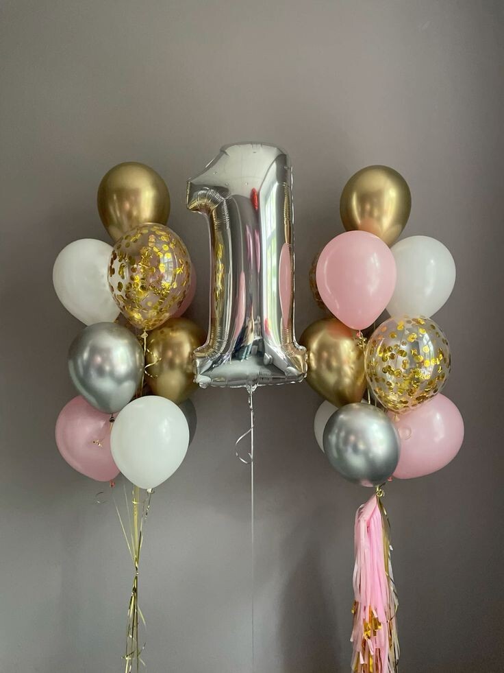 - 2 фонтана из шаров, в каждом из которых 4 шара хром, 2 шара с конфетти, 4 одотонных шара