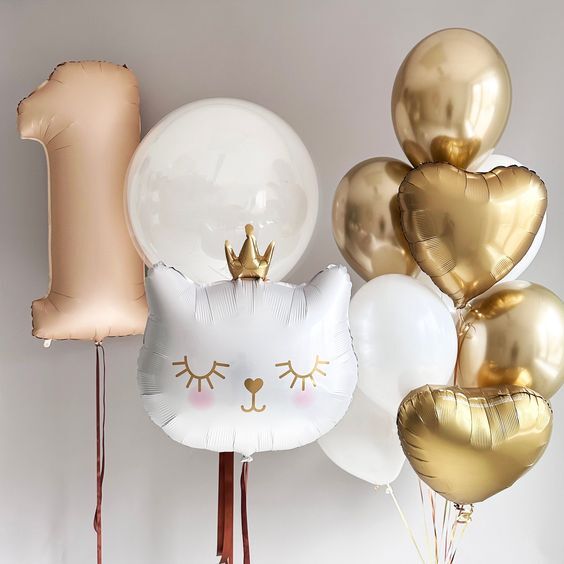 - Фонтан из 10 шаров: 2 фольгированных сердца, 3 шара хром золото, 5 пастельных шаров белого цвета
