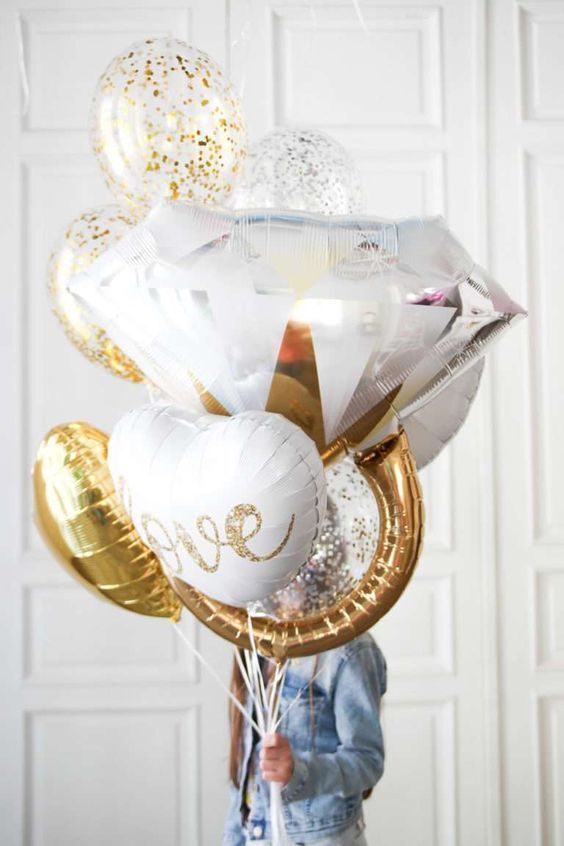 - Фонтан из шаров: 1 фольгированное кольцо, 3 фольгированных сердца, 2 из которых с принтом, 5 шаров с конфетти
