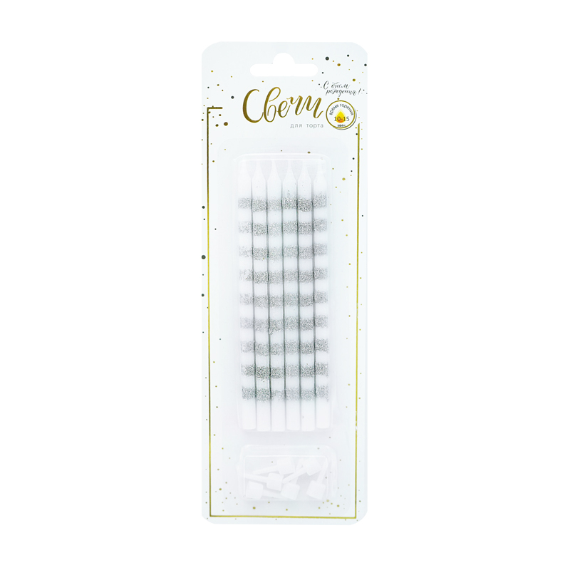 Главная » Интернет-магазин » Товары для праздника » Свечи для торта » Свечи тортовые классические "Гиганты" Полоски серебро с глиттером с держателями
