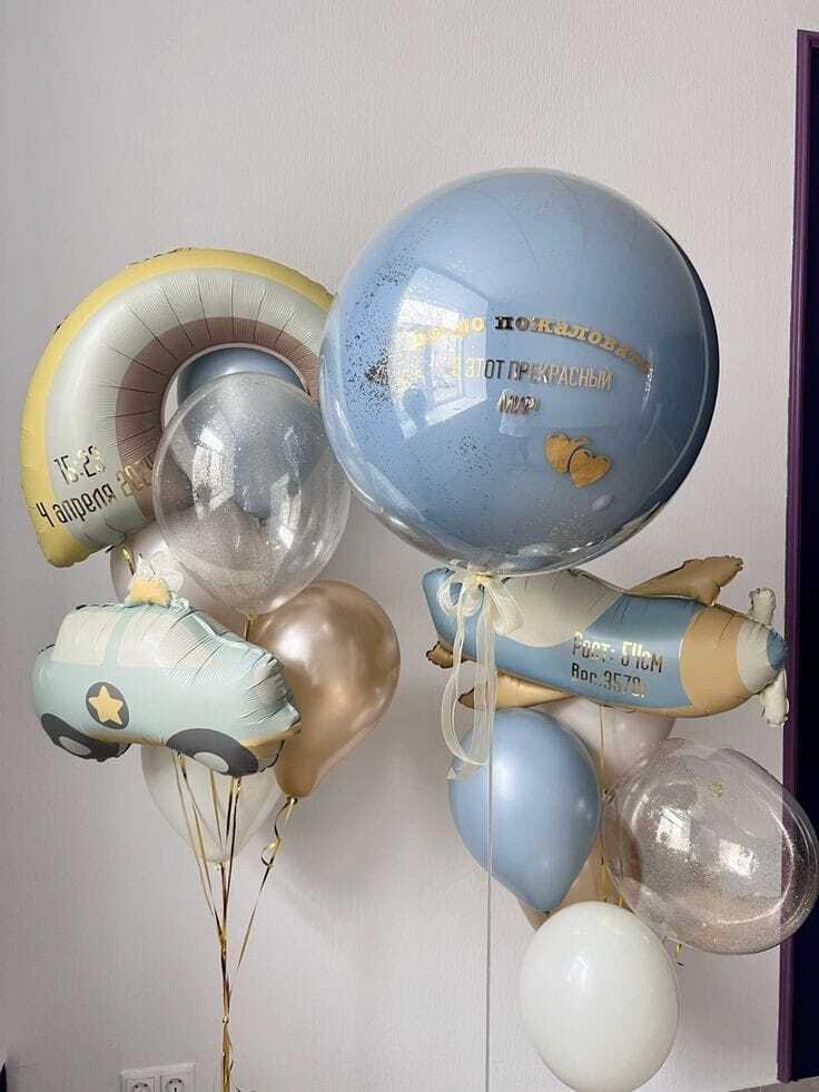 - Фонтан из 7 шаров: 2 фольгированных шара, 4 пастельных шара, 1 шар с конфетти,