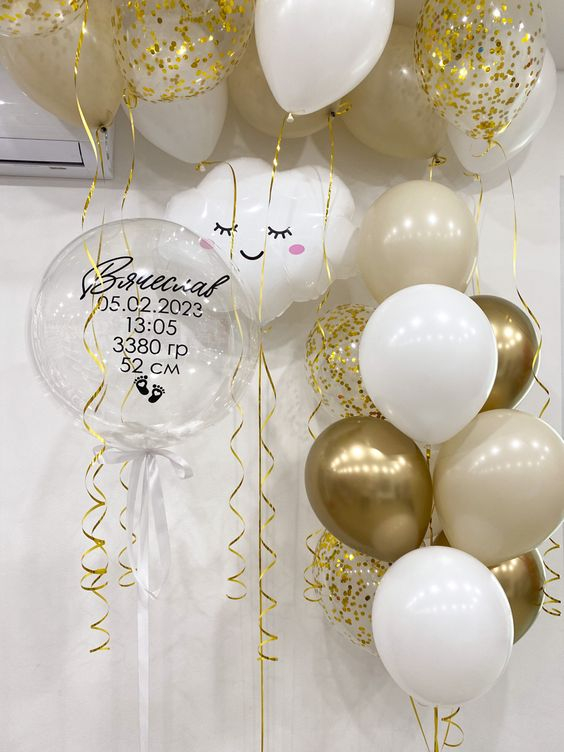 - Шары в потолок: 3 конфетти золото, 3 латекных белых, 3 латексных белых, 3 латексаных бежевых