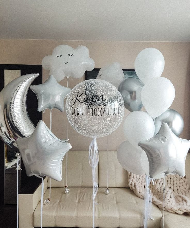 - 1 фонтан: 6 белых латексных, 3 хром серебро